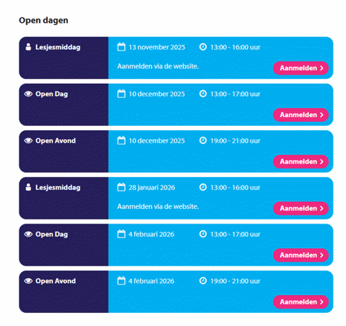 Naast de open lesmiddag en de open middag staan wij ook tijdens de open avond van 19:00-21:00 klaar om jullie te ontvangen. Tot 13 maart! Voor de open avond hoef je niet te reserveren.